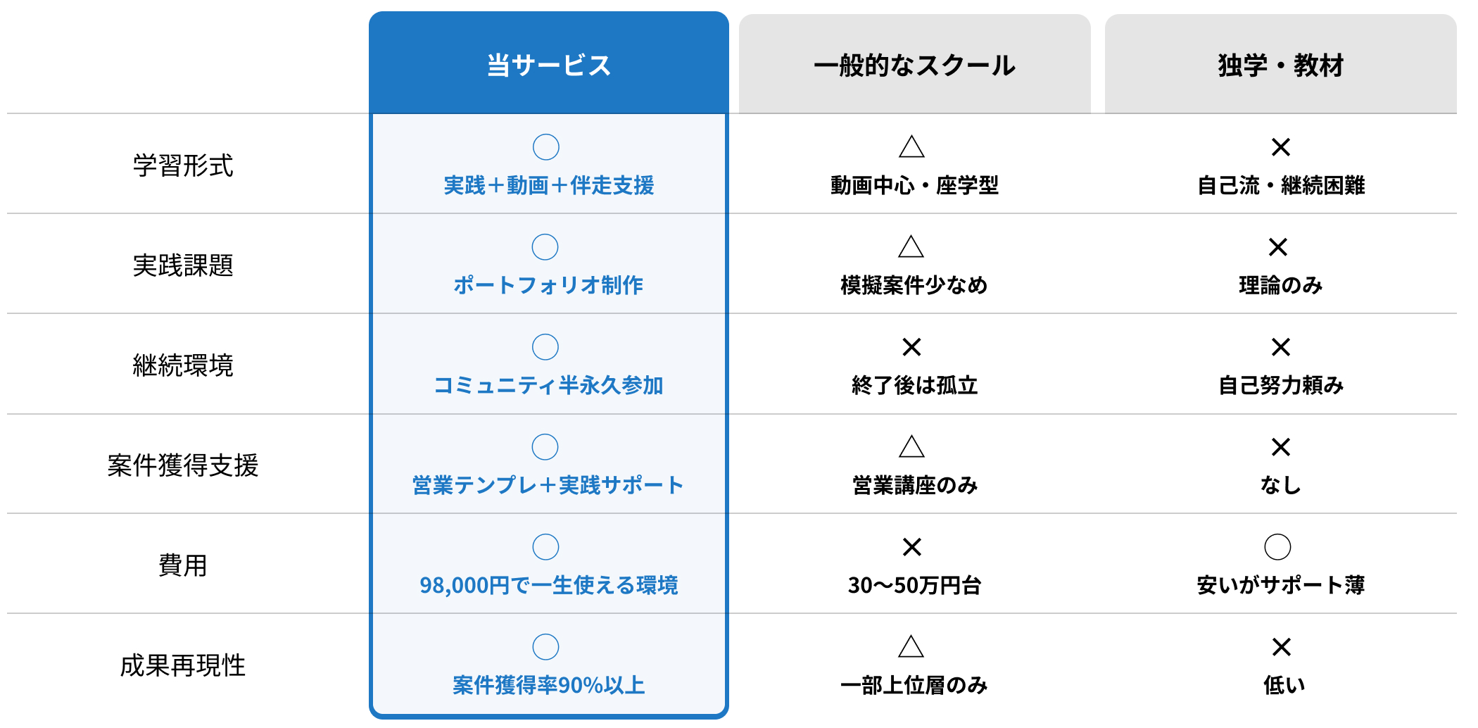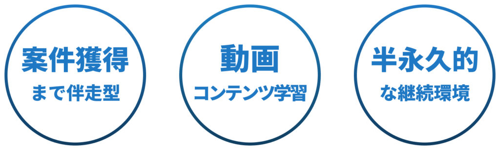 「案件獲得」までを前提にカリキュラムを組んでいるのが特徴です。